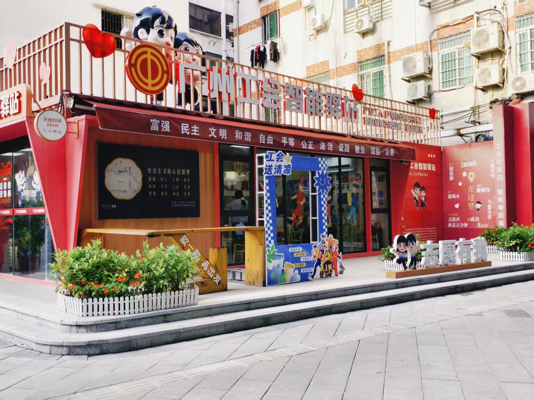 2014年,广州市总工会在全省率先建成首批55家“职工小休站”,为户外劳动者提供饮水、纳凉、热饭、歇脚、应急、充电等基本服务。